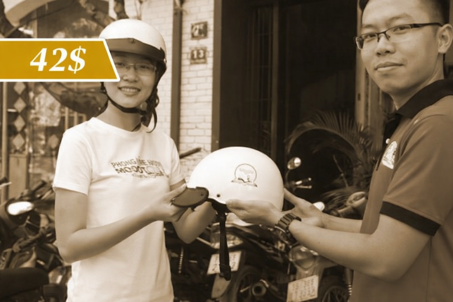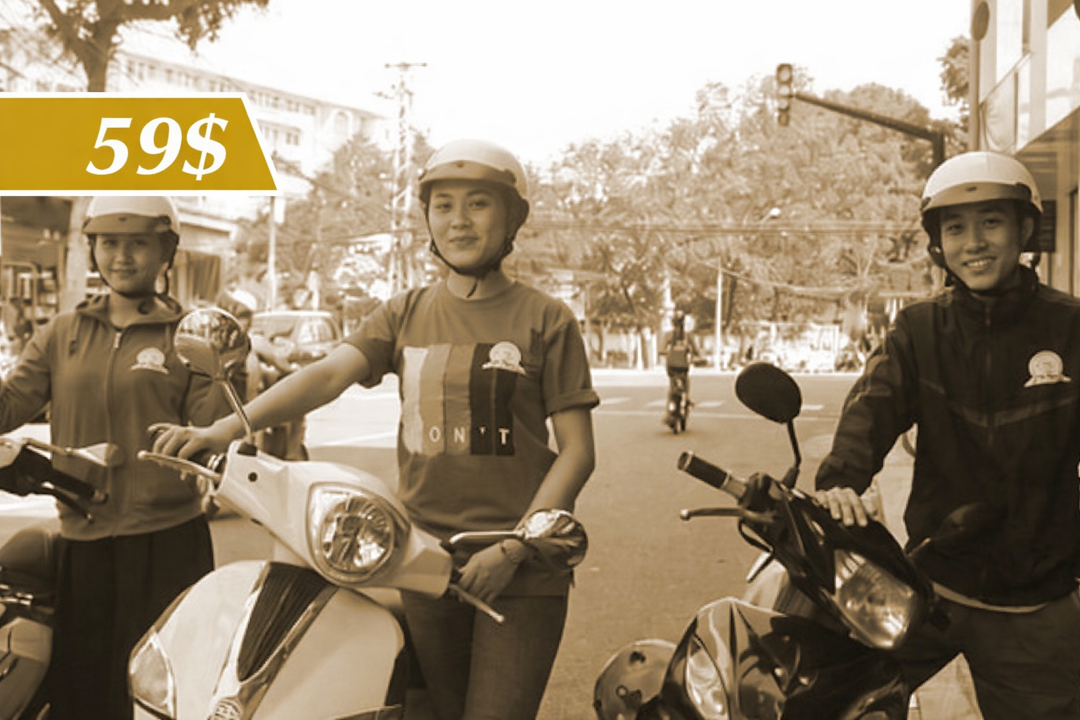 • Our supper guide will pick you up from hotel at 08:30 AM and give you some skills of seating behide him on “his iron horse”. Then he takes you quickly out of city through tiny road that some you think the road is just enough for a scooter and no more. He stops for visiting a Pagoda Orphanage (Loc Tho pagoda) where you will meet many lovely kids. Then keep riding into the countryside with many interesting stops such as: ancient house, conical hat making village, temple, stove making workshop,…
